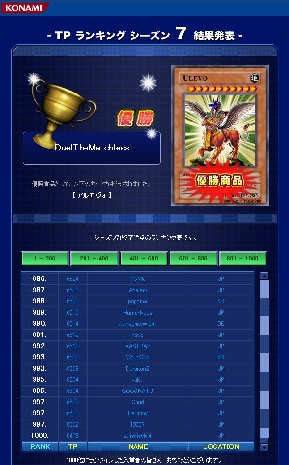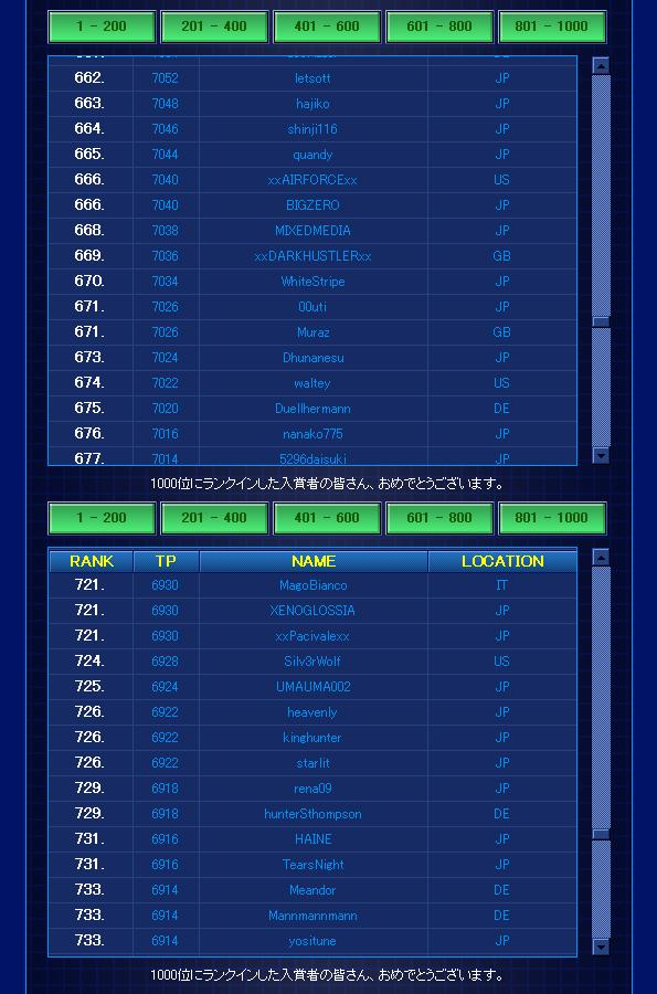 TP ランキング(シ-ズン7)最終結果 TPランキング 2008年09月30日 さてようやくTPランキング(シ-ズン7)の最終結果が出ていました。優勝景品はすでに既出ですが《アルエヴォ》でした。 シ-ズン8でも2垢で行くのでどこまで行けるか。今回からは最終数値の予想が出来るので計画組んで行けるので少しは楽になるでしょう。最終集計TOPは 38896P 10位は 22348P 50位は 15334P1000位は 6498P PR