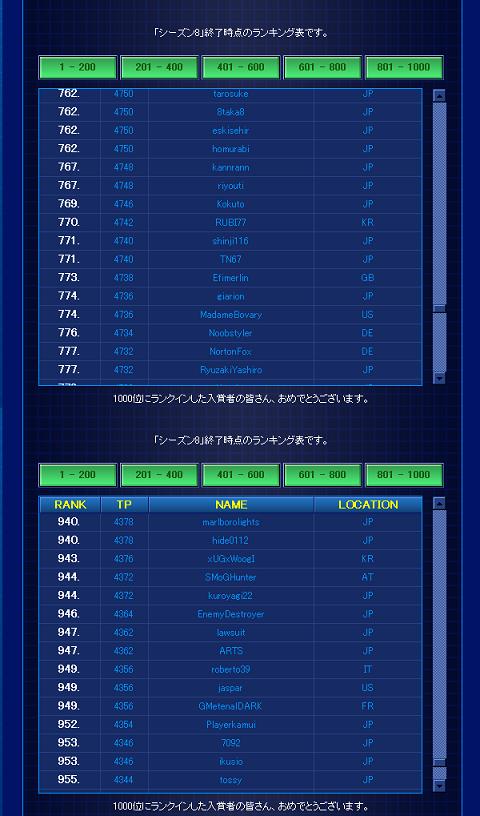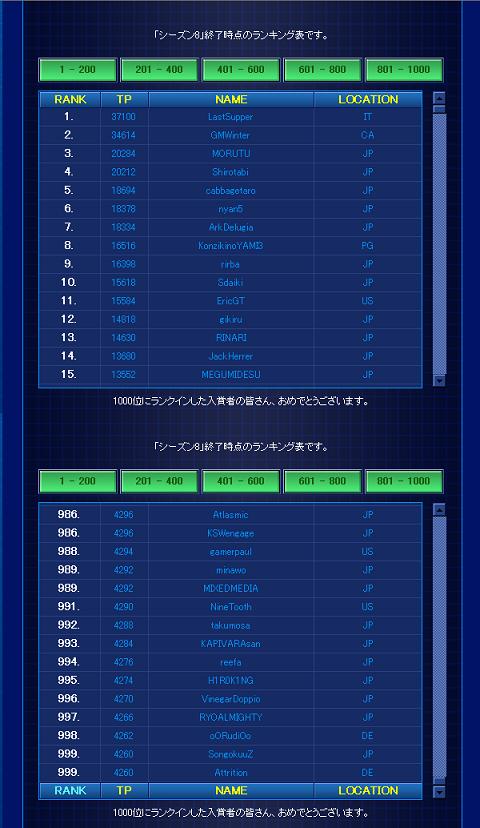 TP ランキング(シ-ズン8) 最終結果 TPランキング 2009年01月19日 TP ランキング(シ-ズン8) 最終結果1月16日午前9時世界ランキング 771位 4740P日本ランキング 586位 4740PTOPは 37100P 10位は 15618P 50位は 10532P1000位は 4260P10位との差 10878P50位との差 5792P1000位との差+480P公式にてTP ランキング(シ-ズン8)の最終報告です。イベントが一回分開催されずじまいと言う不手際があり、しまらない結果となったシ-ズンです。優勝景品は予想通り《メテオ・ザ・マッチレス》です。隠れIDもかろうじてランクIN出来ました。シ-ズン9についてはアルマが最初に開催されるので1000位の最終数値は6000を超える形となるでしょう。 PR