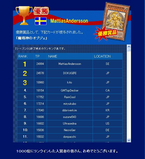 TPランキング(シ-ズン3)最終結果 TPランキング 2007年06月18日 TPランキング(シ-ズン3)最終結果いつのまにか更新されていました。優勝商品は、《究極竜騎士》ではなく《魔導神のオブジェ》。《ヴィクトリー・ドラゴン》、マッチキルモンスタ-の種族違い及び属性違い。ある意味レアだが、《究極竜騎士》方がよっぽどいいと思うが。まあこれでマッチキルモンスタ-の種族違い、属性違いが制限リストに載っている理由がわかったが。今開催中のシ-ズン4景品もおのずと予想できてしまう。なんだかなあ。ついでに自身のシ-ズン1~3の最終結果。シ-ズン1 世界ランキング 16位 10578P日本ランキング 11位 10578Pシ-ズン2世界ランキング 89位 3898P日本ランキング 52位 3898Pシ-ズン3世界ランキング 74位 9854P日本ランキング 46位 9854Pこうしてみるといかにガンスで7連できていないのがよくわかる。今のままだとシ-ズン4は一番悪い成績で終わりそうだ。挽回せねば。 PR