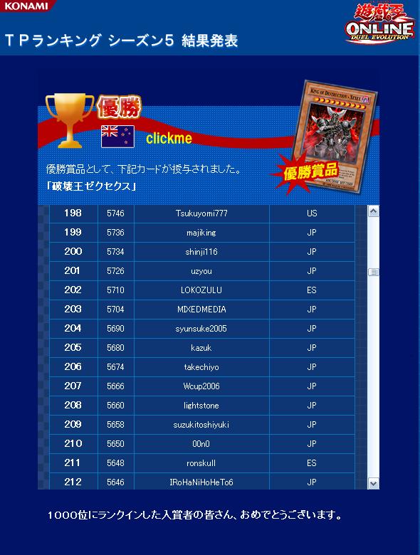 TPランキング(シ-ズン5) 最終結果 TPランキング 2008年01月09日 TPランキング(シ-ズン5) 最終結果 世界ランキング 200位 5734P日本ランキング 141位 5734PTOPは 17692P 10位は 13174P50位は 9564P1000位は 3626P優勝景品は《破壊王ゼクセクス》シ-ズン6はもう少しがんばるか。 PR