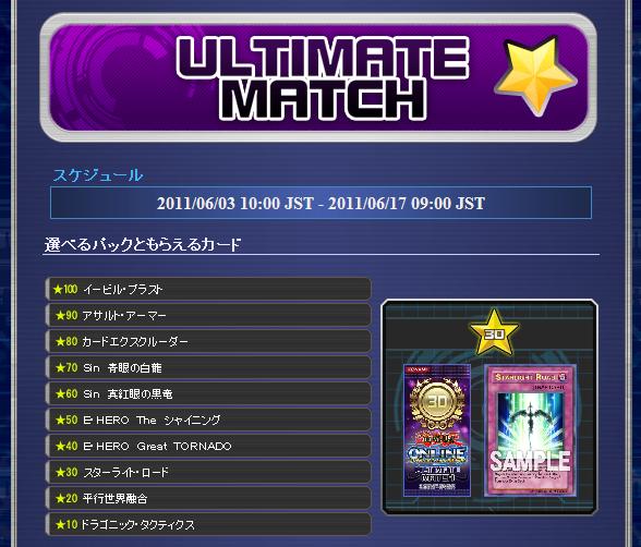 YO3 第9回 アルティメット・マッチ アルティメット・マッチ 2011年06月01日 ☆100《イービル・ブラスト》☆90《アサルト・アーマー》☆80《カードエクスクルーダー》☆70《Sin 青眼の白龍》☆60《Sin 真紅眼の黒竜》☆50《E・HERO The シャイニング》☆40《E・HERO Great TORNADO》 ☆30《スターライト・ロード》☆20《平行世界融合》 ☆10《ドラゴニック・タクティクス》思わず吹いたw。何この神ラインナップこれは本気出すしかないw。