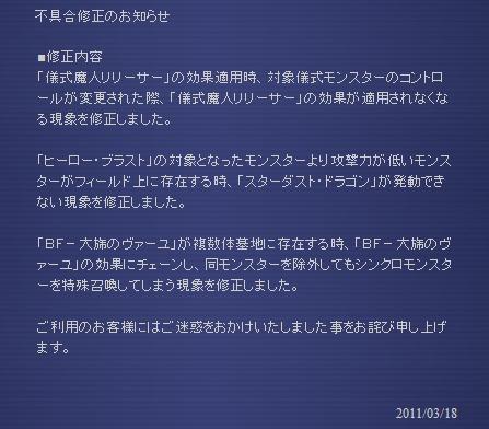 YO3 エボリューション・マッチ 第12回 エボリューション・マッチ 2011年03月18日 ☆10《インフェルニティ・ガーディアン》☆20《インフェルニティ・デーモン》 ☆30《堕天使ディザイア》さて新シーズンです。頑張りましょう。
