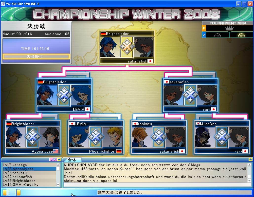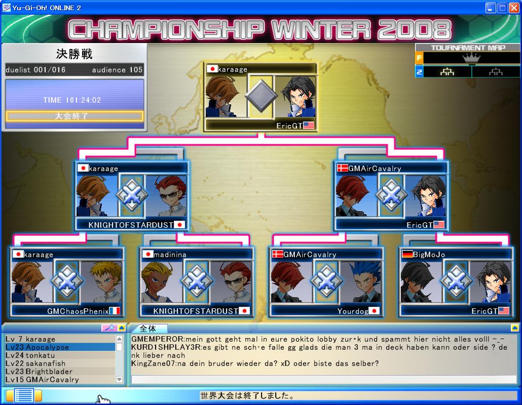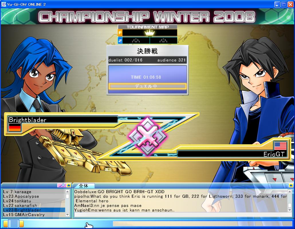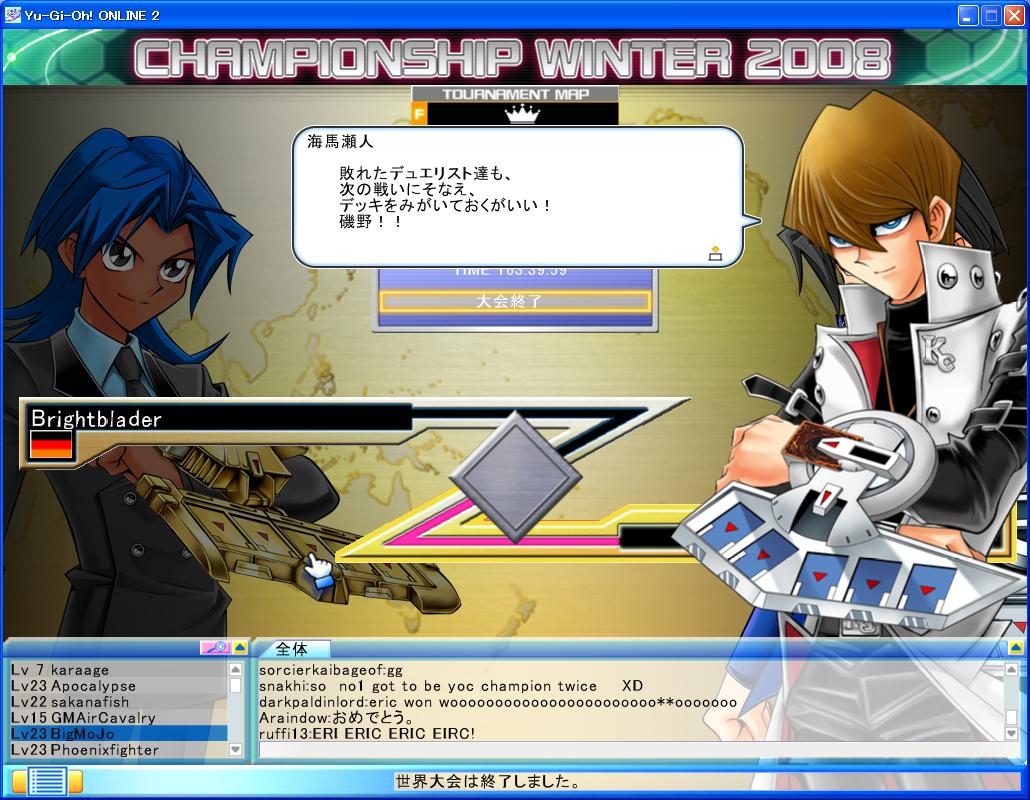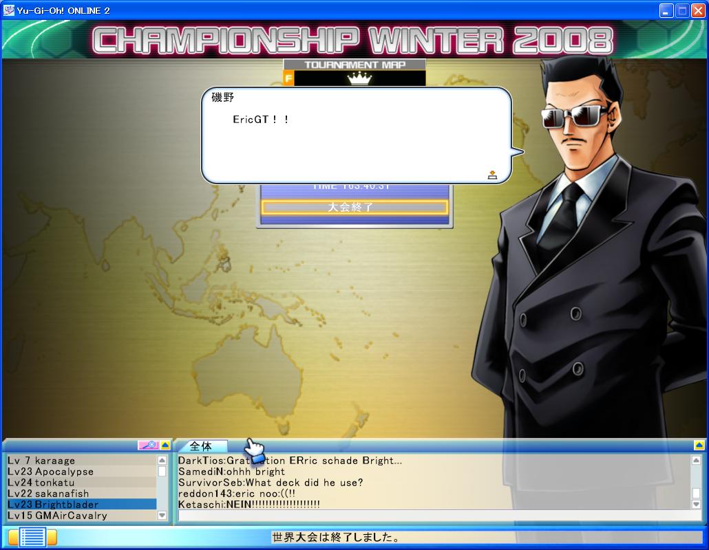 YUGIOH ONLINE CHAMPIONSHIP WINTER 2008 決勝大会 CHAMPIONSHIP 2009年01月05日 さてYUGIOH ONLINE CHAMPIONSHIP WINTER 2008 決勝大会 が開催されました。ではいつもの磯野の挨拶。フレはこちら側のブロック兵どもがこちら側に固まりましたね。で決勝は予想通りにBrightbladerさんが上がって来ました。対するはフレを倒したEricGTさん。でいつものようにバチバチしてます。で結果、優勝したのはEricGTさん。まあどちらが勝ってもおかしくない実力同士だと思います。でお決まりの社長の挨拶です。で決勝が終ったあとベスト8とベスト16の景品を見せて頂きました。サンキュ-青年よ。で下記が景品の一覧です。優勝《XYZ-ドラゴン・キャノン》(柄違い)準優勝《E・HERO スパークマン》(エド、覇王仕様)ベスト4《グラヴィティ・ベヒモス》ベスト8《ボタニカル・ライオ》 ベスト16《ボルテック・コング》 ちょw、私が予想した結果通りじゃねえかw。何故か罪悪感を感じてしまう。まあ誰もが予想できたとは思いますが。さて残るイベントはエボマッチアルマについてはシ-ズン8なのかはまだ未定です。最後まで頑張りたいと思います。次こそは予選突破したいです。腕を磨いておきます。追記ログを見れば分かりますが勝っているのはすべて剣闘獣です。どうみても剣闘大会でした。これで規制を受けるのはまず間違いないでしょう。 PR