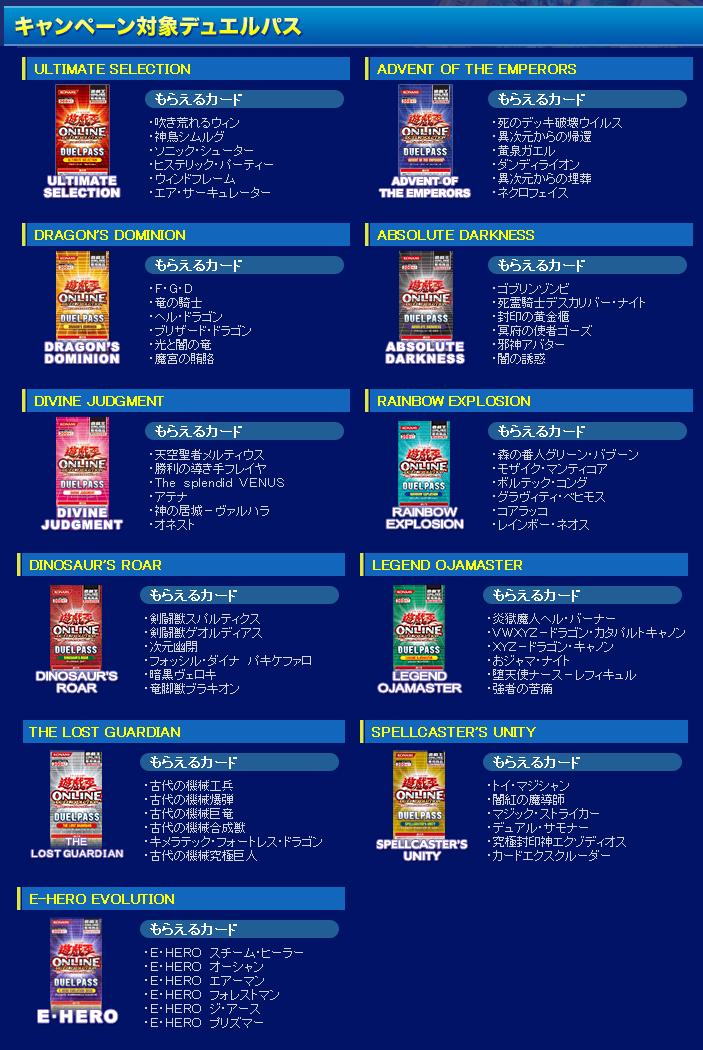 デュエルパスキャンペーン その他 2009年09月11日 さて制限改訂が発表されましたがもうひとつとんでもないことが。既存とデュエルパスとYO2になってから販売され、今は絶版となっているデュエルパス。こちらに期間限定ですが一部の高レートカードがランダムでもらえるという企画を立ち上げてきました。上記がそのリストです。と言うか廃盤のパスをいつ再販しますとか書いとけよw。どうやって手に入れるんだよwヤフオクで高いの落とせってか。こういったところがいい加減なんですよ、コンマイはしかし、正直これは痛いw。何千MP死んだか正直わかりませんw。下手すれば万逝くかもしれない。これを終了フラグと取るかYO3への布石と見るかは皆さん次第です。とりあえず泣いていいですか。 PR