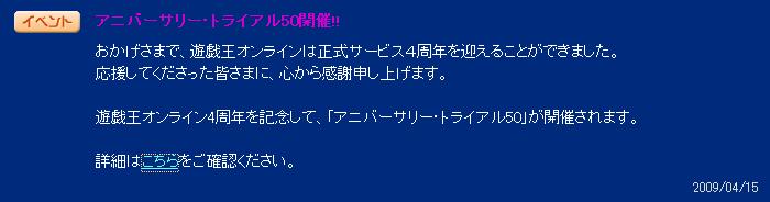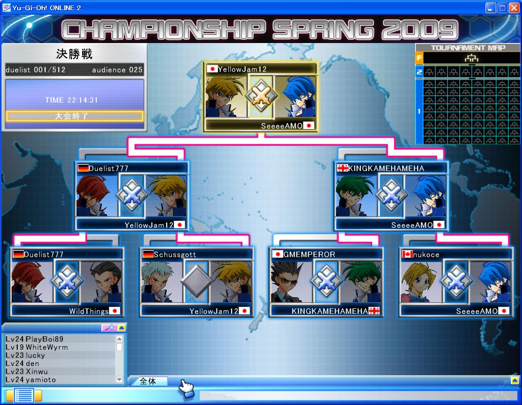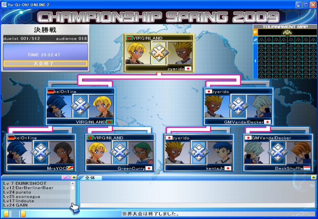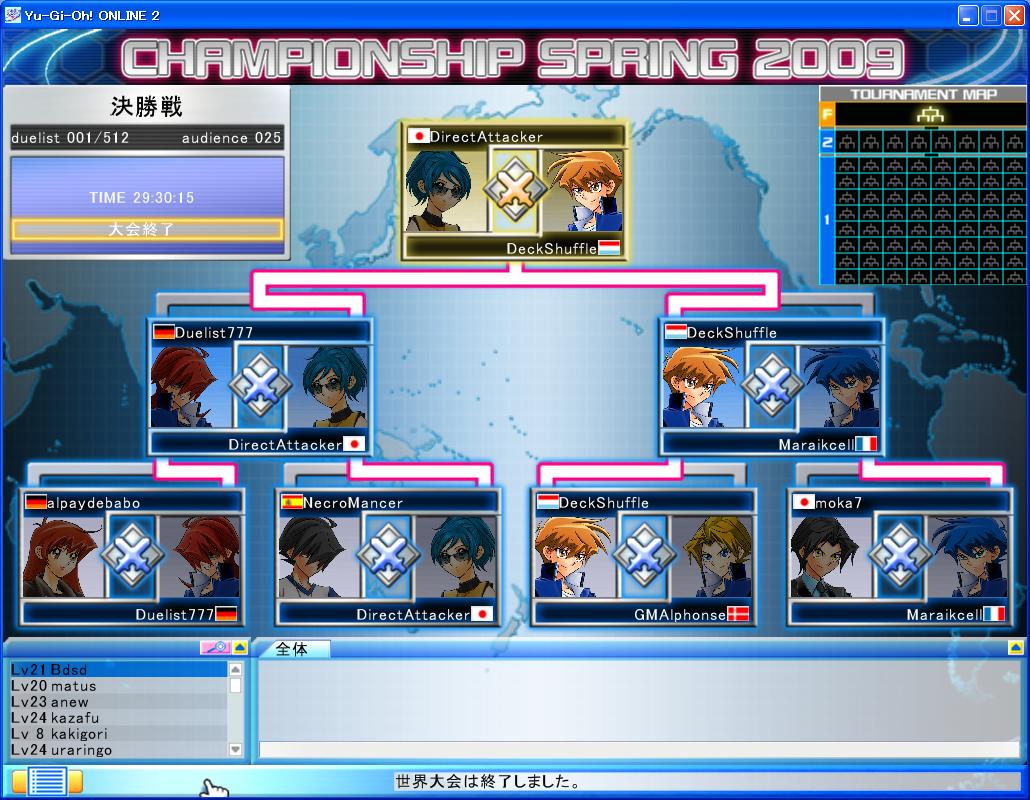 YUGIOH ONLINE CHAMPIONSHIP SPRING 2009 予選第6回 CHAMPIONSHIP 2009年04月13日 サブID①で予約していたので参加。メインは抽選落ち1回戦 VS次元剣 ミラ-マッチ。 サイドラ呼んで洗脳で 相手の剣パクってガイザレス。2回戦 VSベンケイ マジストに装備品で ダイレクトされるも チェンバで燃やし 非常食で凌いで燃やしきった。3回戦 VSデミスブランコ 初手のダストでライザ-戻され デミスで乙。引きがチ-タ-でした。 TP稼いだのでよしとします。
