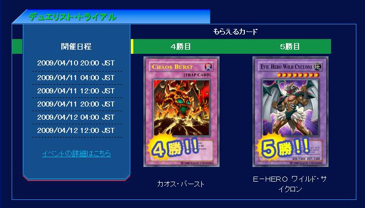 エボリューション・マッチ 第22回 夜の部④ エボリューション・マッチ 2009年04月05日 ①○×○ ベンケイ ②○○ フルバーン③○×× 76枚ライトロード ④○○ 73枚デッキ ⑤鯖⑥×鯖 次元ビート⑦×○○ 黄泉帝⑧×○× ライトロード⑨○○ ライトロード ⑩×○○ 光パーミ つづきはこちら