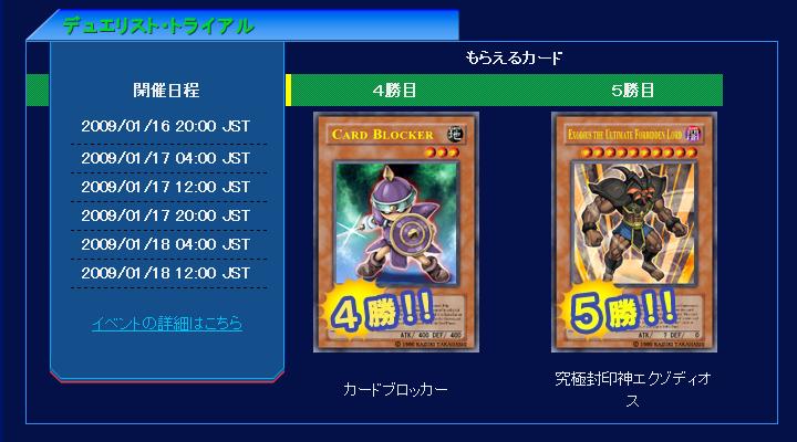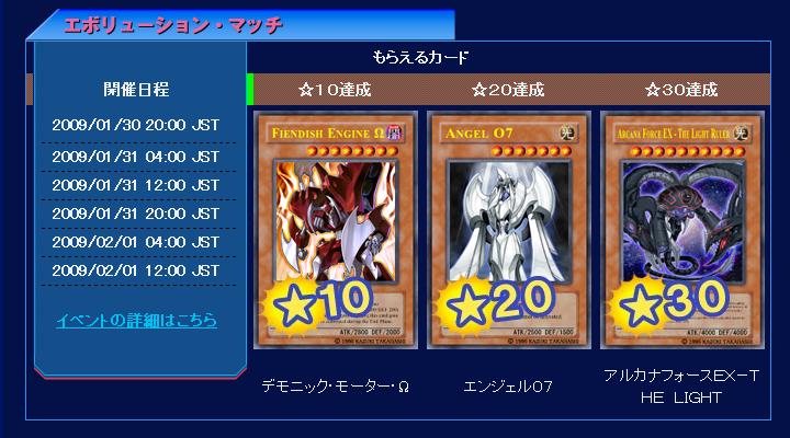 エボリューション・マッチ 第19回、第20回 エボリューション・マッチ 2009年01月13日 ☆10《デモニック・モーター・Ω》☆20《エンジェルO7》☆30《アルカナフォースEX-THE LIGHT RULER》 つづきはこちら
