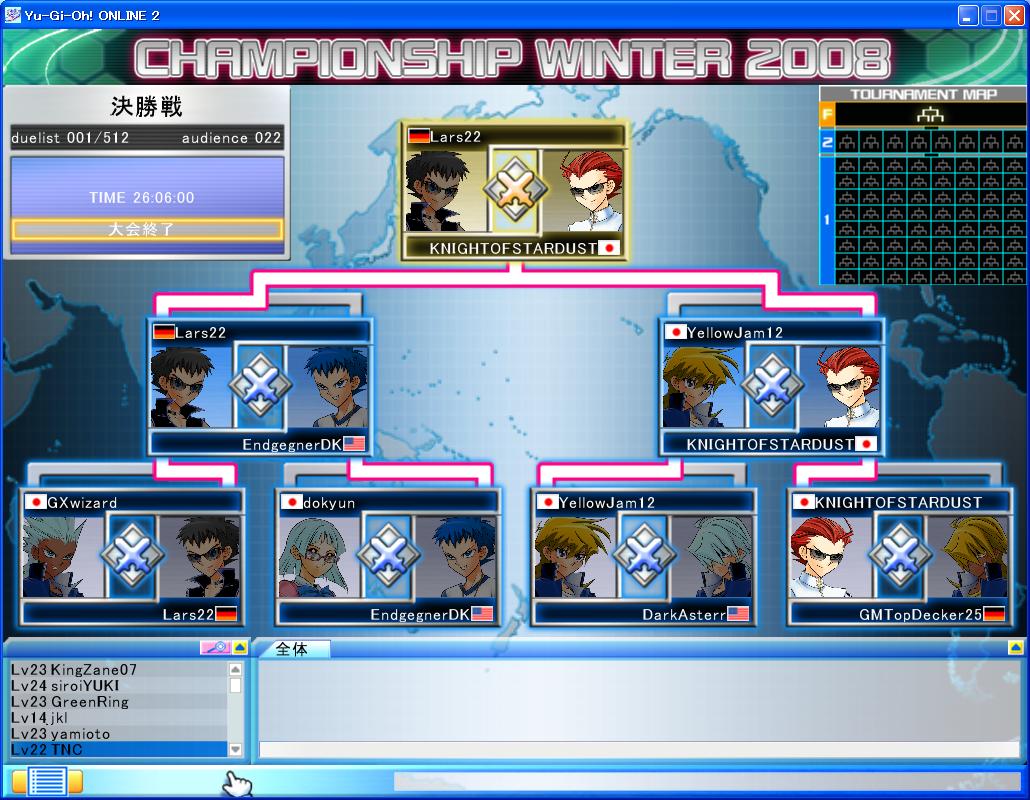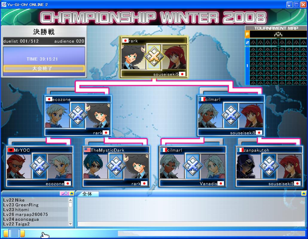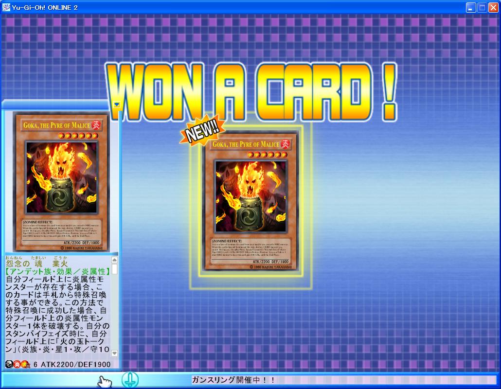 YUGIOH ONLINE CHAMPIONSHIP WINTER 2008 予選 第6回 CHAMPIONSHIP 2008年12月14日 YUGIOH ONLINE CHAMPIONSHIP WINTER 2008 予選 第6回サブIDパ-ト②で予約で参加。隠れIDは抽選落ち結果一回戦 剣でしたが慎重にプレイしつつ ショッカ-で押し込みました。2回戦 剣を使用。ガイザゲ-で勝利。3回戦 VSライロ あえて帝で行きましたが 押し切られて負け。う-んダメですな、次頑張ります。