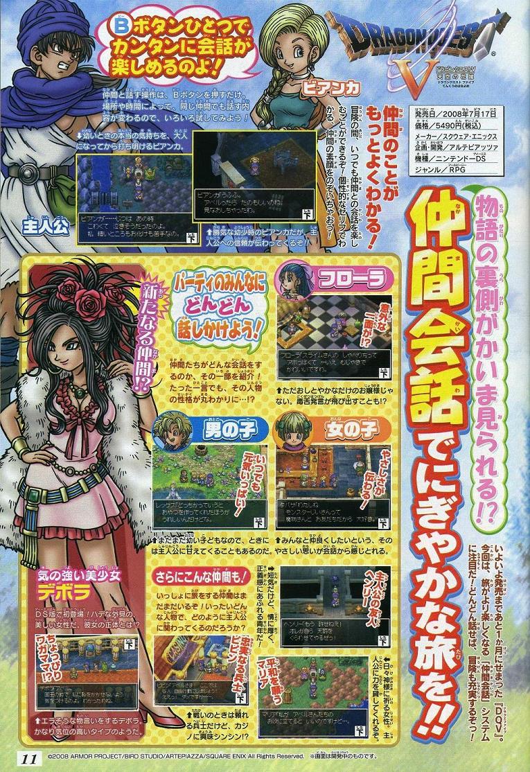 ドラゴンクエストⅤ 天空の花嫁(DS版) その② NDS 2008年06月17日 さてDSのドラクエⅤ情報。追加要素についておそらくは花嫁の追加と思われる。以前はビアンカかフロ-ラの2択でしたが新たにデボラが登場。三つ巴と言うヤツですか。他にまだ追加要素があるのかは不明。わかればUPします。