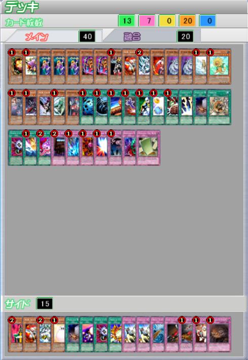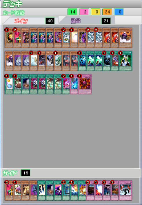 水晶帝デッキ Ver2.5 デッキレシピ 2008年05月22日 デッキ詳細モンスタ- 24枚《執念深き老魔術師》、《見習い魔術師》3、《クリッター》《人造人間-サイコ・ショッカー》、《雷帝ザボルグ》《炎帝テスタロス》2、《氷帝メビウス》《風帝ライザー》、《冥府の使者ゴーズ》《D.D.クロウ》、《サイバー・ドラゴン》2《黄泉ガエル》、《魔装機関車 デコイチ》2《水晶の占い師》2、《エンド・オブ・アヌビス》 《冥界の魔王 ハ・デス》、《マシュマロン》 魔法 14枚《大嵐》、《サイクロン》、《早すぎた埋葬》、《抹殺の使途》《スケープ・ゴート》、《洗脳-ブレインコントロール》 《クロス・ソウル》2、《エネミーコントローラー》2 《貪欲な壺》、《おろかな埋葬》 、《デビルズ・サンクチュアリ》2 罠 2枚《死のデッキ破壊ウイルス》、《激流葬》サイドデッキ《地帝グランマーグ》、《人造人間-サイコ・ショッカー》《E-HERO マリシャス・エッジ》 《地砕き》、《シールドクラッシュ》《魔法効果の矢》、《ライトニング・ボルテックス》 《おろかな埋葬》、《月の書》《王宮のお触れ》、《聖なるバリア-ミラーフォース-》 《リビングデッドの呼び声》、《ダスト・シュート》 《炸裂装甲》 さてこちらは水晶帝デッキこちらも制限改訂後に若干変更したもの。まあ、殆ど変わっていません。帝同士でミラ-になり1ドロ-勝負になった際相手の伏せが《マシュマロン》や《魂を削る死霊》だった場合の為にサイドに貫通能力を持つ《E-HERO マリシャス・エッジ》を指したぐらい。ガンスでも十分戦えるし8連以上したこともある。只上級が多い目なので事故ればどうにもなりませんが事故るのは承知の上での構成です。しかし回れば強いので最近のメインデッキの一つとなっています。次は六武衆のデッキレシピでも上げて見ます。