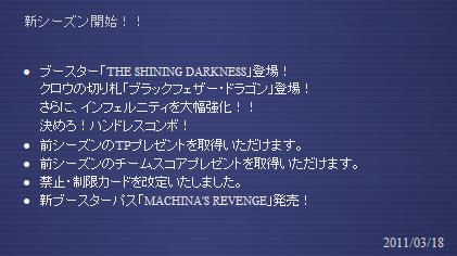 YO3 エボリューション・マッチ 第12回 エボリューション・マッチ 2011年03月18日 ☆10《インフェルニティ・ガーディアン》☆20《インフェルニティ・デーモン》 ☆30《堕天使ディザイア》さて新シーズンです。頑張りましょう。