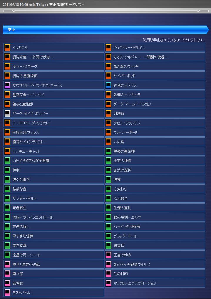 YO3 デュエリスト・トライアル 第13回 結果 トライアル 2011年03月10日 4勝目《インフェルニティ・ドワーフ》 5勝目《インフェルニティ・デストロイヤー》 完全無欠にスルーしました。まあガンスは出ます。