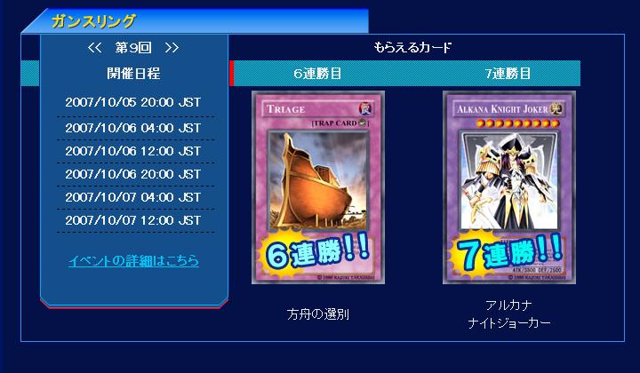 ガンスリング 第18回(EVO) ガンスリング 2007年10月04日 6連勝 《方舟の選別》 7連勝 《アルカナ ナイトジョーカー》 さて明日はガンスリング。どうなることやら。2週目なのでバ-ンはいつものごとくで増殖するでしょうが。少し対策しておくか。