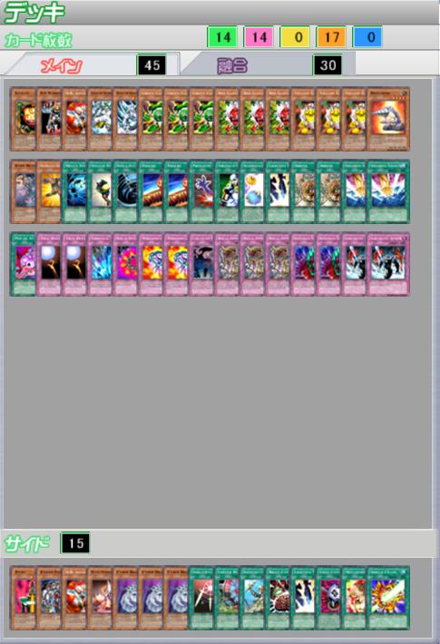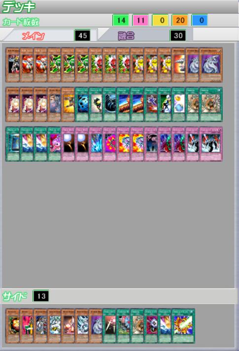 閃光ガジェットデッキ Ver.1.0 デッキレシピ 2007年07月22日 ガジェットが3セットそろったので早速組んでみました。閃光ガジェットと言うより除去ガジェットかな。《レッド・ガジェット》、《グリーン・ガジェット》《イエロー・ガジェット》は各3枚。俗に言う9ガジェ。《サイバ-・ドラゴン》は2枚。《閃光の追放者》は3枚。除去系カ-ドは各2枚。サイドには《氷帝メビウス》、《雷帝ザボルグ》もサイドに指す。そこそこ回った感じ。まだまだ未完成です。とりあえず実戦で調整していきます。