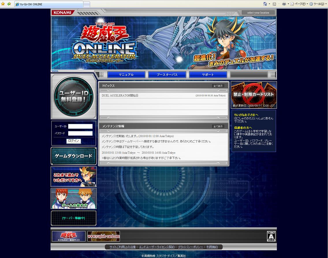 公式より その他 2010年03月05日 DUEL EVOLUTION停止日程および、DUEL ACCELERATOR 正式サービス日程のお知らせ 遊戯王ONLINE DUEL EVOLUTIONの停止日程および、DUEL ACCELERATOR正式サービスの日程は下記を予定しております。■DUEL EVOLUTIONを、3月1日 8:00 に停止いたします。■DUEL ACCELERATOR βテストを、3月1日 8:00 に停止いたします。■DUEL ACCELERATOR 正式サービスは、3月5日 となります。※開始時刻は未定です※2010年3月1日以降は、DUEL EVOLUTIONでは遊べなくなります ↑メンテナンス延長中。また一文追加しやがったw。まあいつものこと気長に待ちます。