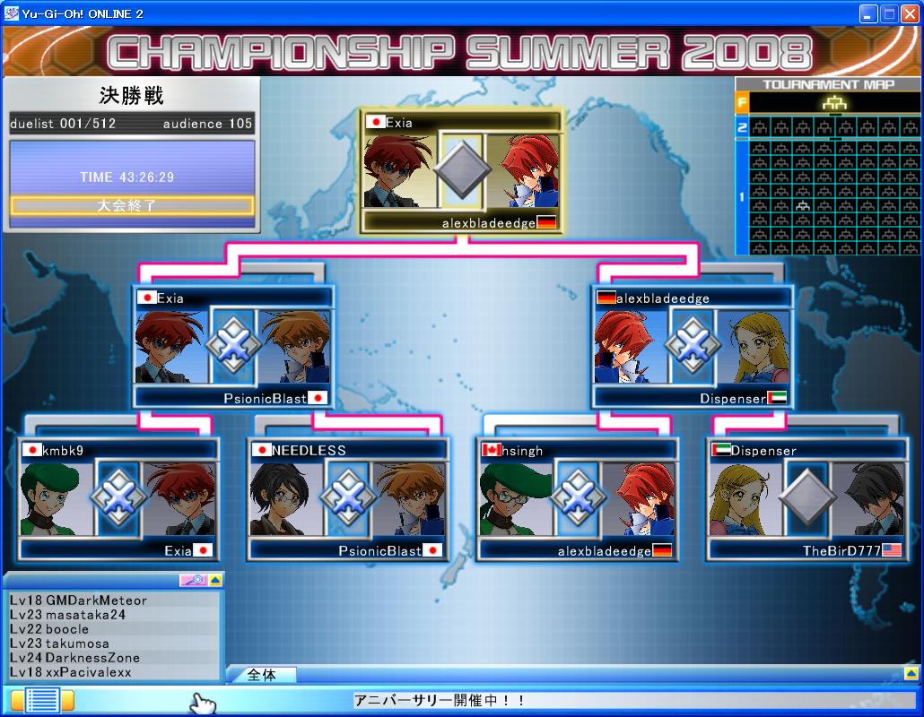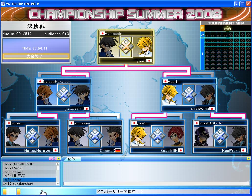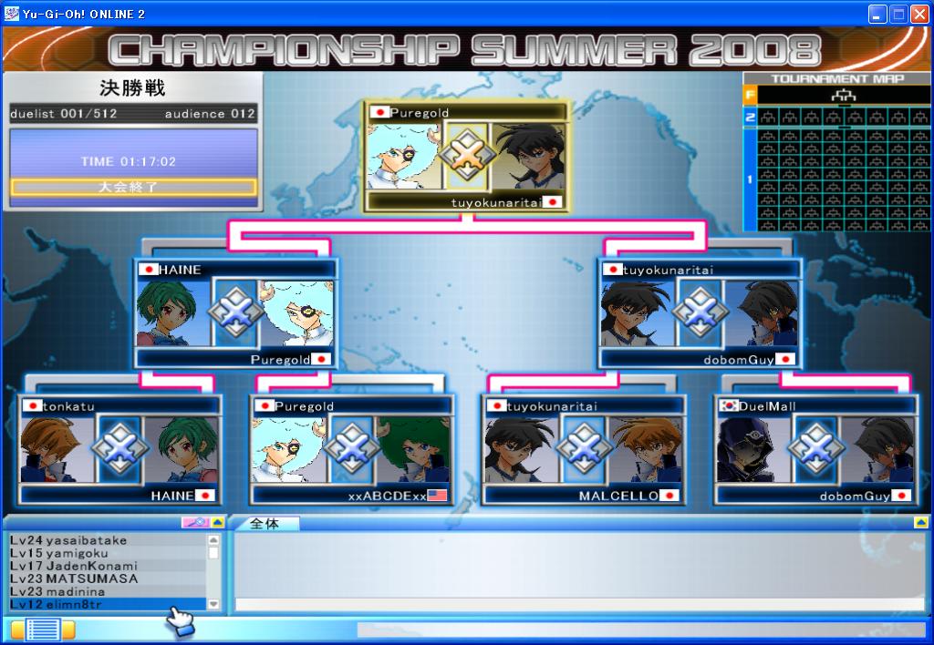 YUGIOH ONLINE CHAMPIONSHIP SUMMER 2008 予選第10回 CHAMPIONSHIP 2008年08月13日 抽選枠にて参加メインと隠れで参加以下結果隠れID 1回戦 3タ-ンでダムダム降臨。メインID1回戦 普通に勝ち2回戦 ヴォルカニック デビルに負けた。
