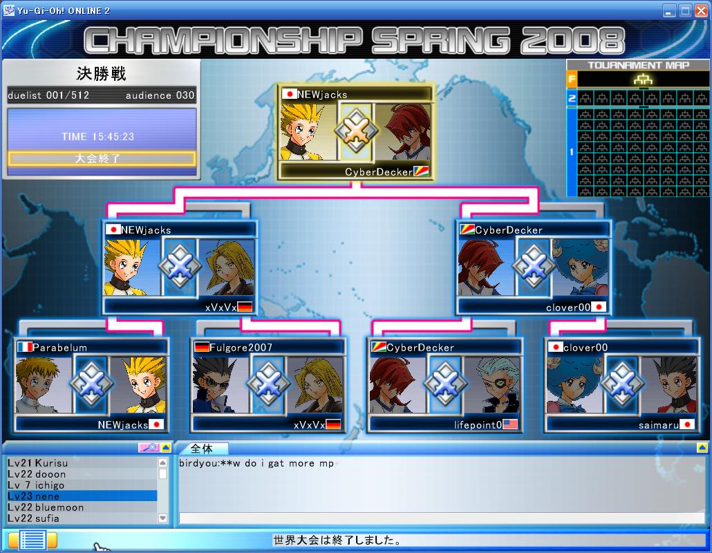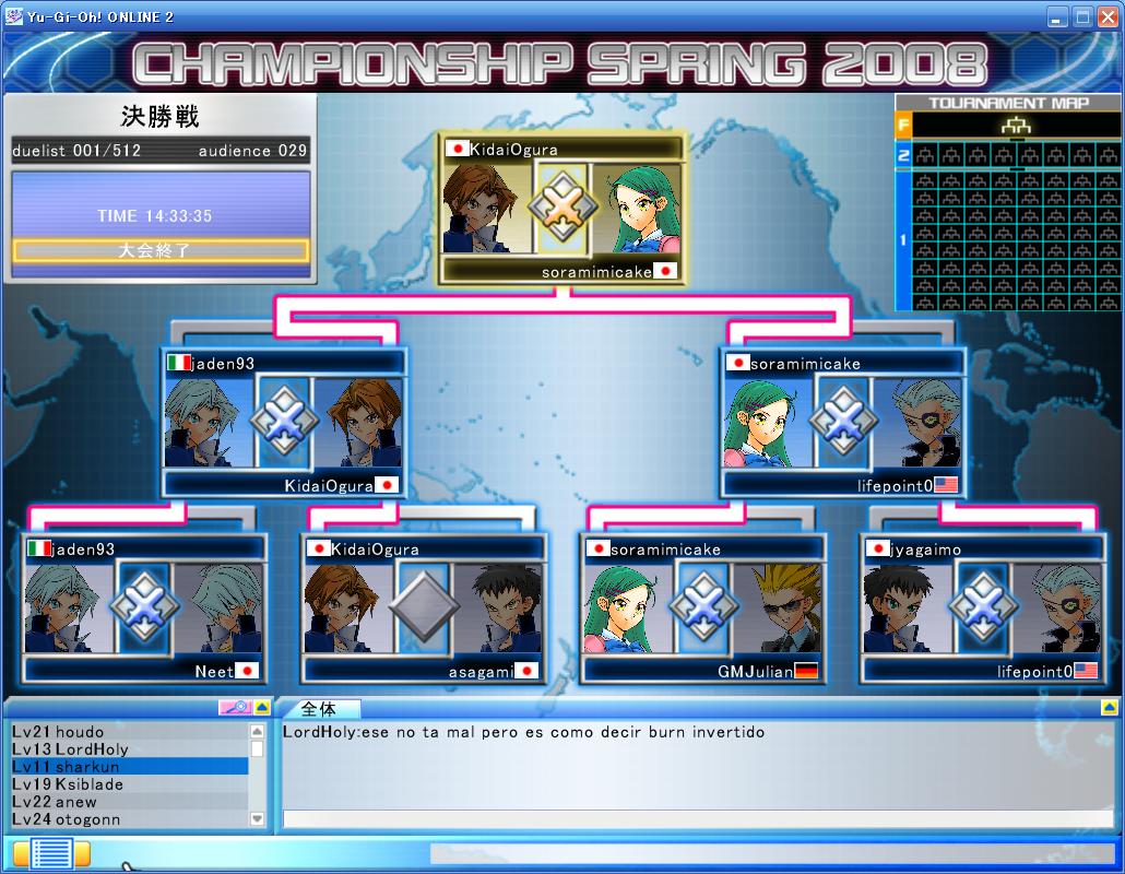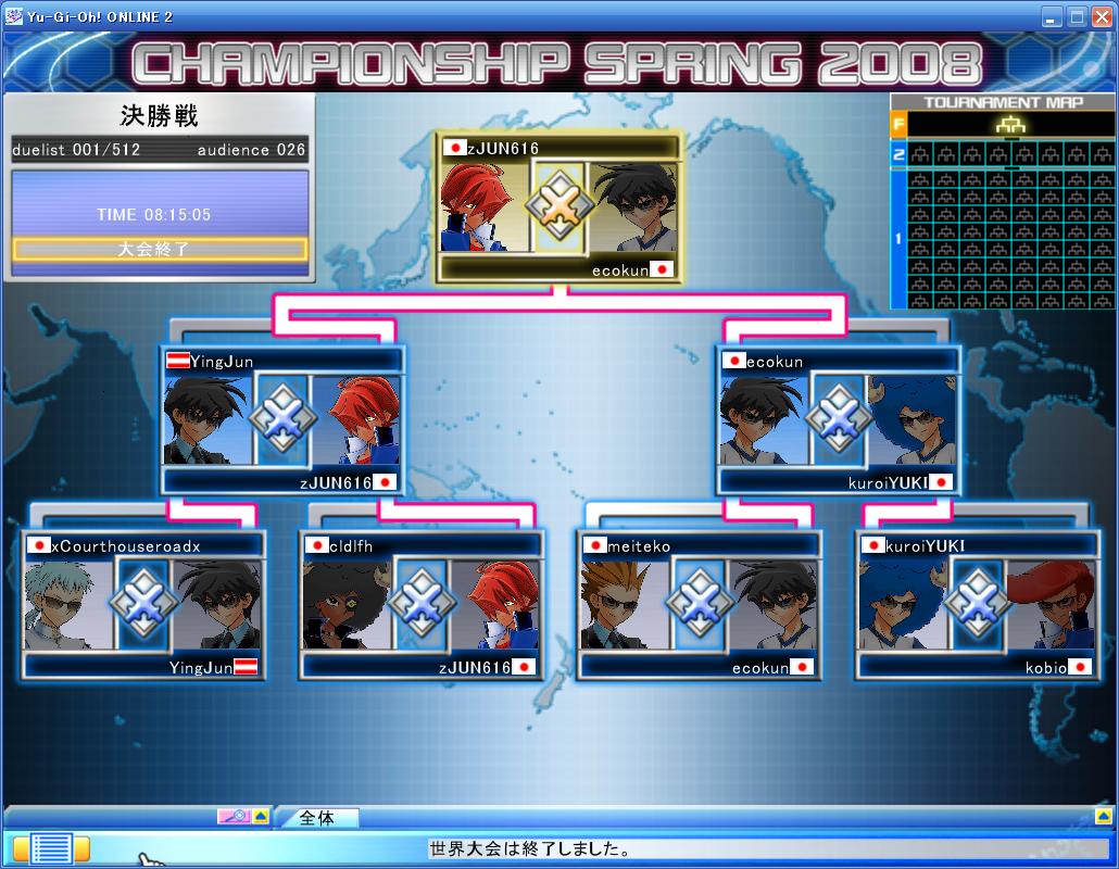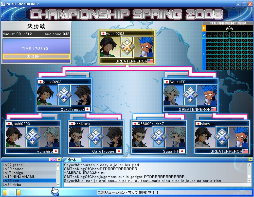 YUGIOH ONLINE CHAMPIONSHIP SPRING 2008 予選 第11回 CHAMPIONSHIP 2008年04月02日 YUGIOH ONLINE CHAMPIONSHIP SPRING 2008 予選 第11回結果優勝は優勝はzzJUNJUN616さんでした。さすがいったところですところです。
