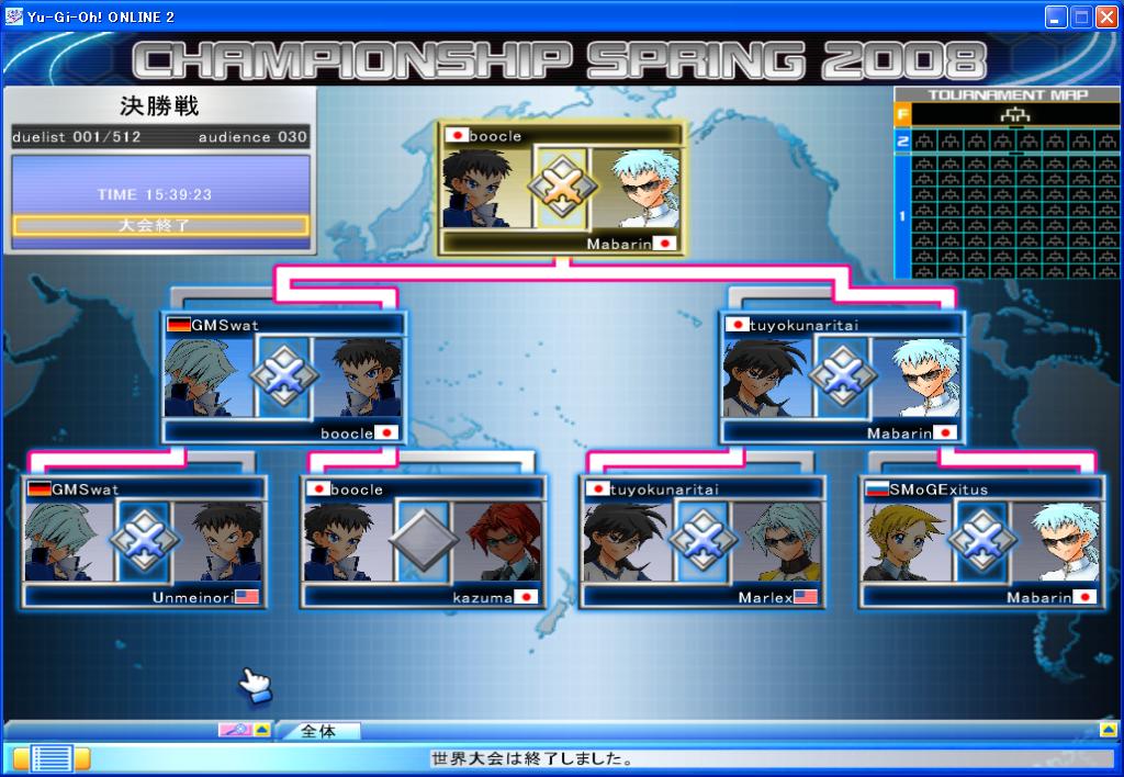 YUGIOH ONLINE CHAMPIONSHIP SPRING 2008 予選 第16回 CHAMPIONSHIP 2008年04月12日 3回戦負けなんで45枚デッキが初手にゴ-ズを持っているんだ。1回戦 バ-ン ショッカ-様に感謝2回戦 スタン 押し切りました。3回戦 スタン 最初にゴ-ズ出されてOUT 最高3回戦で終わりました、春の予選。世の中不条理だ。