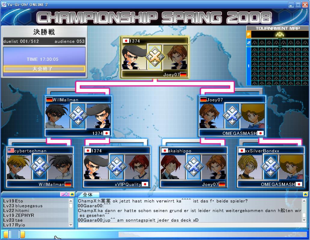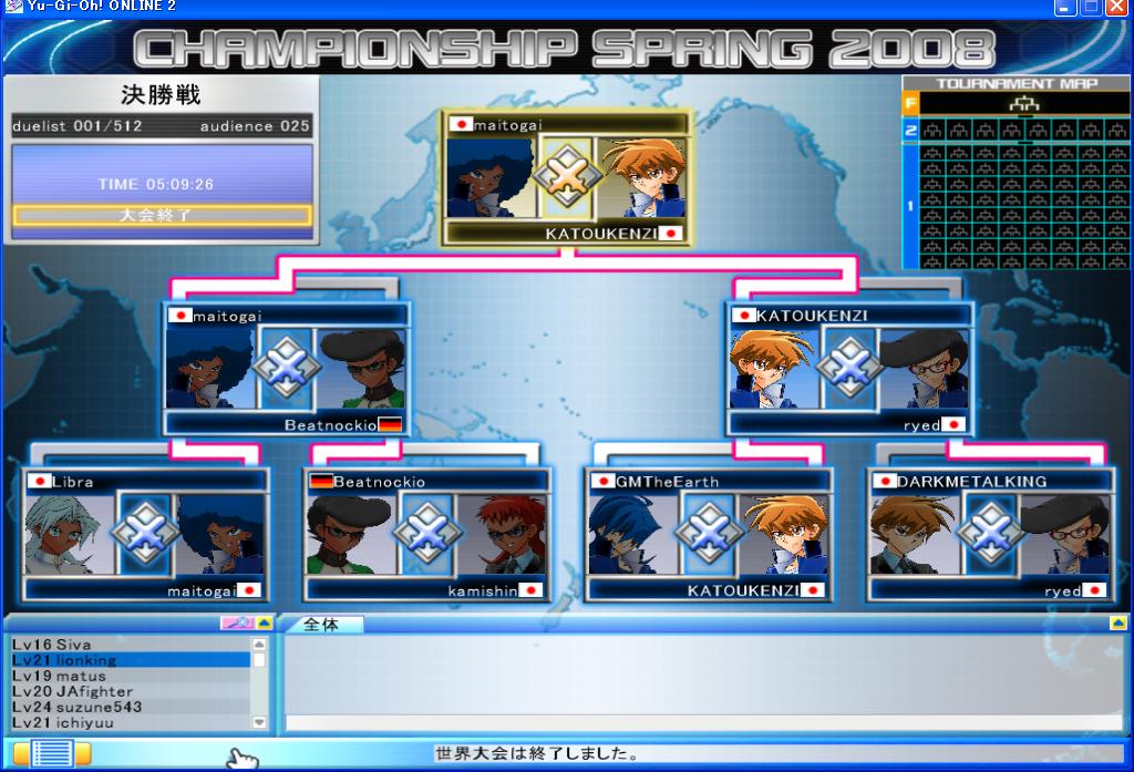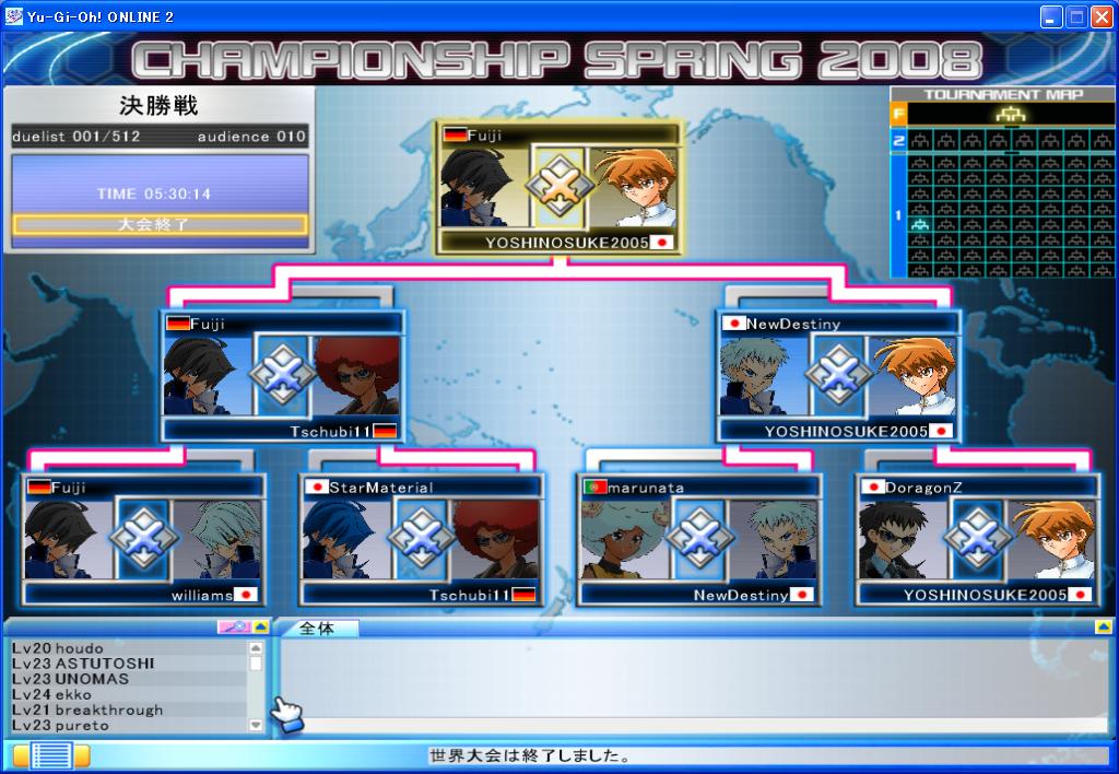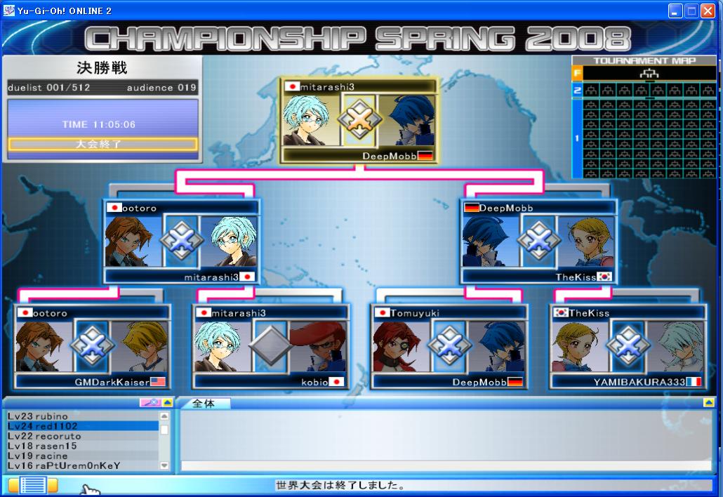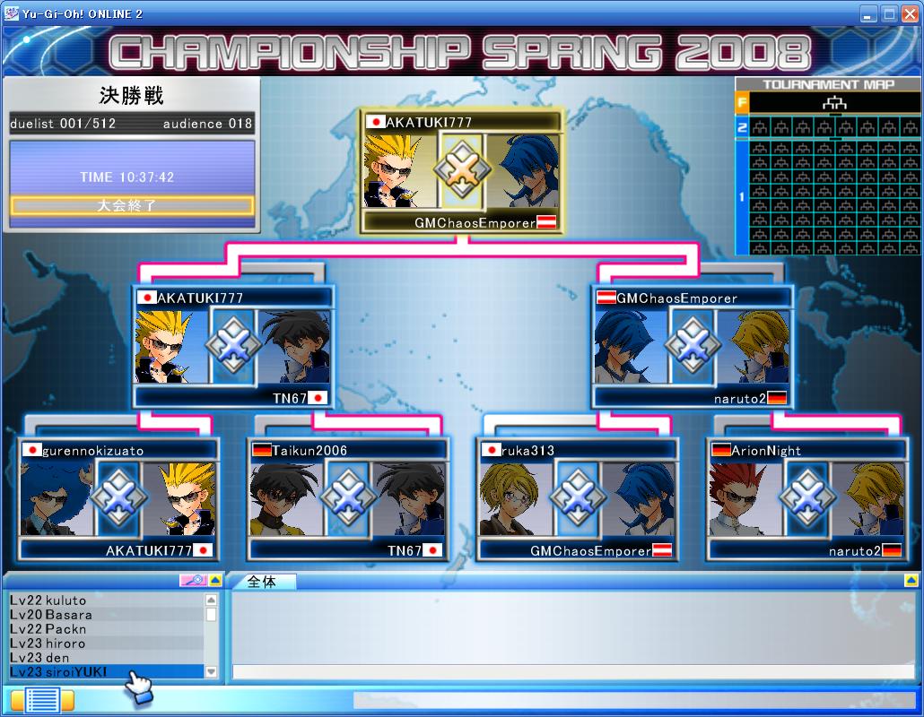 YUGIOH ONLINE CHAMPIONSHIP SPRING 2008 予選 第6回 CHAMPIONSHIP 2008年03月24日 YUGIOH ONLINE CHAMPIONSHIP SPRING 2008 予選 第6回結果優勝はAKATUKI777さん彼は日韓戦の代表の一人でもあります。やはり強いです