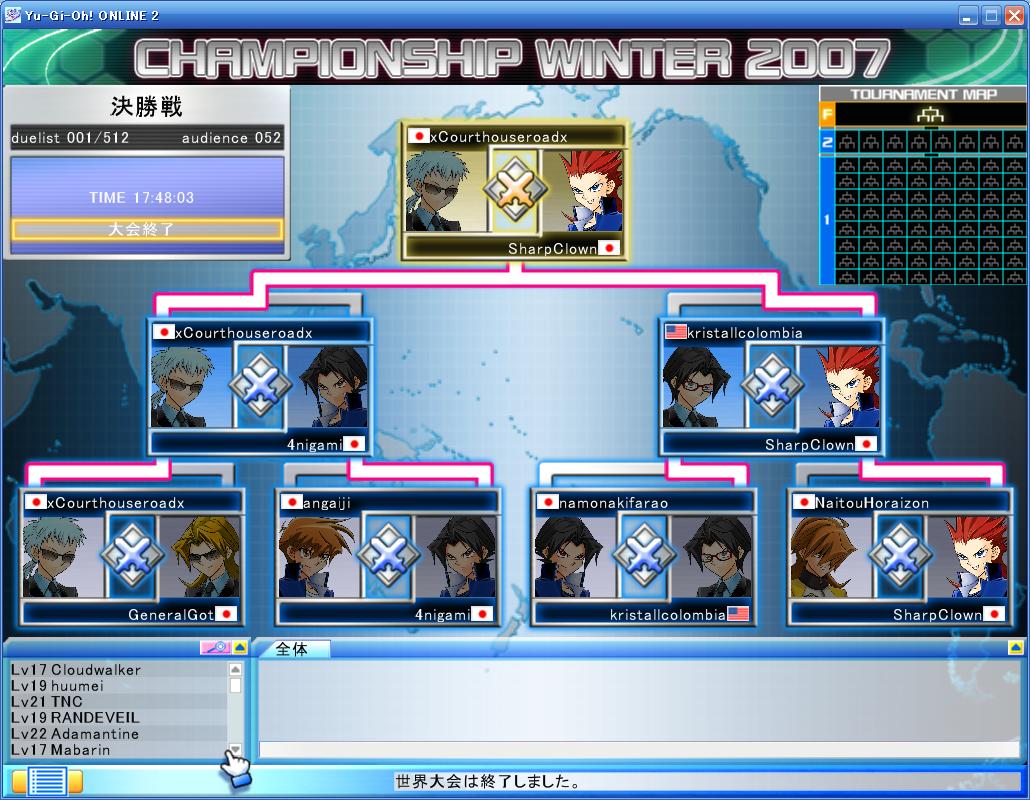 CHAMPIONSHIP WINTER 2007 予選 第13回 CHAMPIONSHIP 2007年12月10日 CHAMPIONSHIP WINTER 2007 予選 第13回 結果優勝はbokuhaKAMISAMAさん。名前は受け狙いかな?デッキはガジェット、相手は黄泉帝。ガジェットが勝ち抜いているので流行っているな。神の宣告もまず投入されている。やっぱ影響大きいわ。