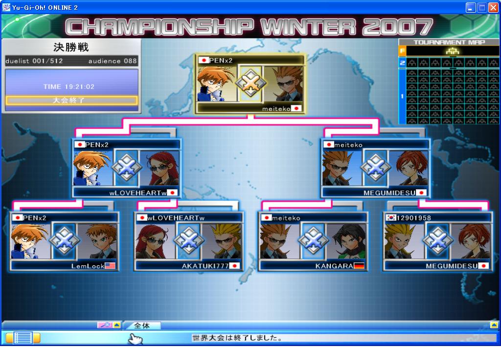CHAMPIONSHIP WINTER 2007 予選 第14回 CHAMPIONSHIP 2007年12月11日 CHAMPIONSHIP WINTER 2007 予選 第14回 結果優勝はPENx2さん。デッキはガジェット。やっぱ帝対策施したガジェットが一番いいのか?。