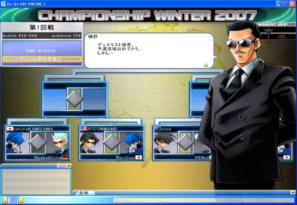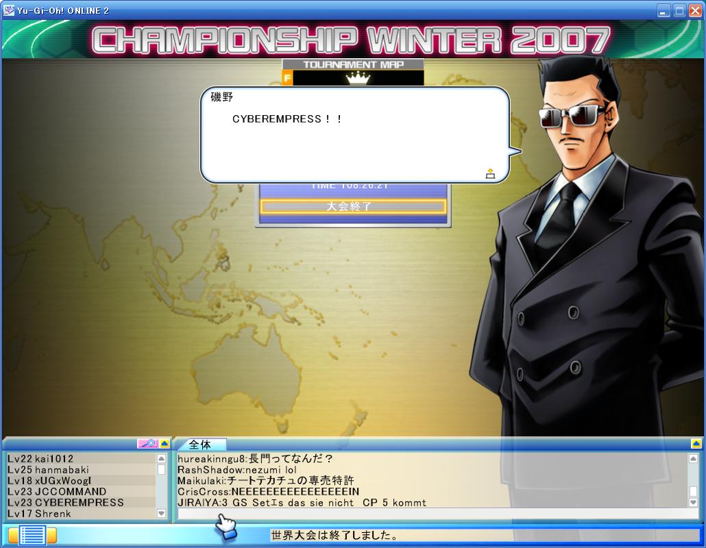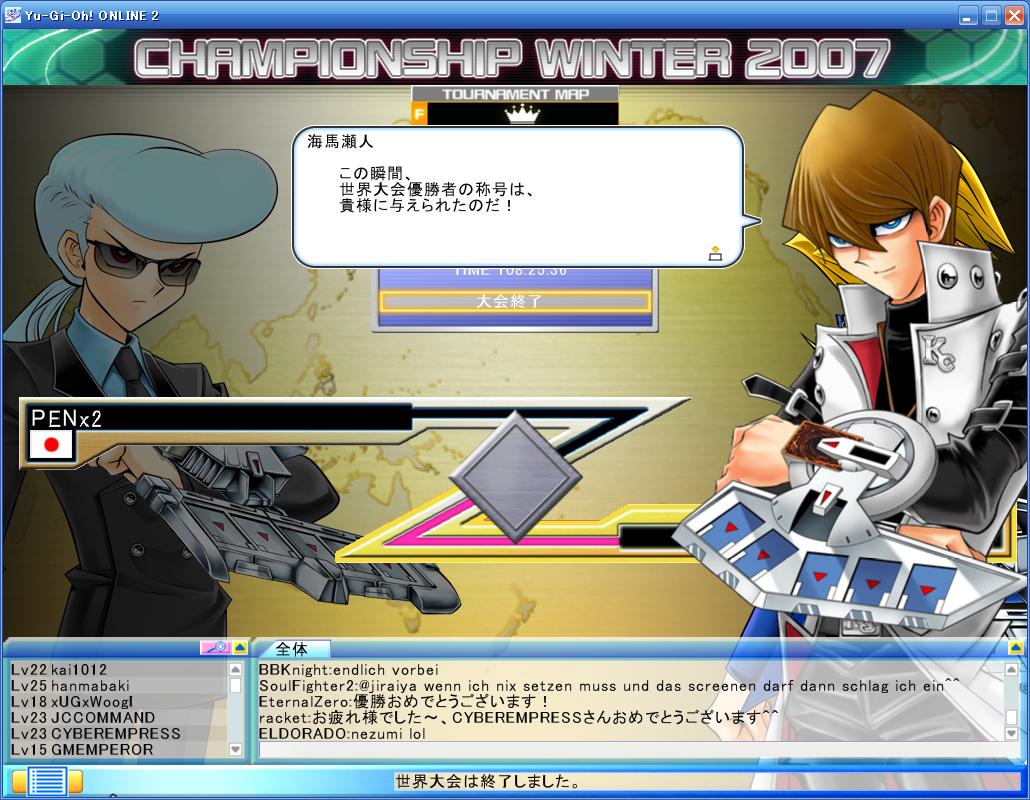 CHAMPIONSHIP WINTER 2007 決勝大会 CHAMPIONSHIP 2007年12月16日 さて2007年を締めくくる決勝大会。まずは磯野の挨拶。そして決勝大会スタ-ト左側の組み合わせ右側の組み合わせそして決勝CYBEREMPRESSさん対PEN2さんデュエル中この時間がまちどおしい。優勝はCYBEREMPRESさん。さすがだ。お決まりの社長の挨拶これにて2007年度の日程終了。下記が景品優勝《サイバー・エンド・ドラゴン》(シャド-仕様)準優勝《青眼の白龍》(社長仕様)ベスト4《デスサイズ・キラー》ベスト8《埋蔵金の地図》 ベスト16《ミスト・ボディ》今回はベスト4~ベスト16は手抜きだな。さて次は3月。今回はふがいない成績ばっかりだったので来年こそファイナルで行きたいです