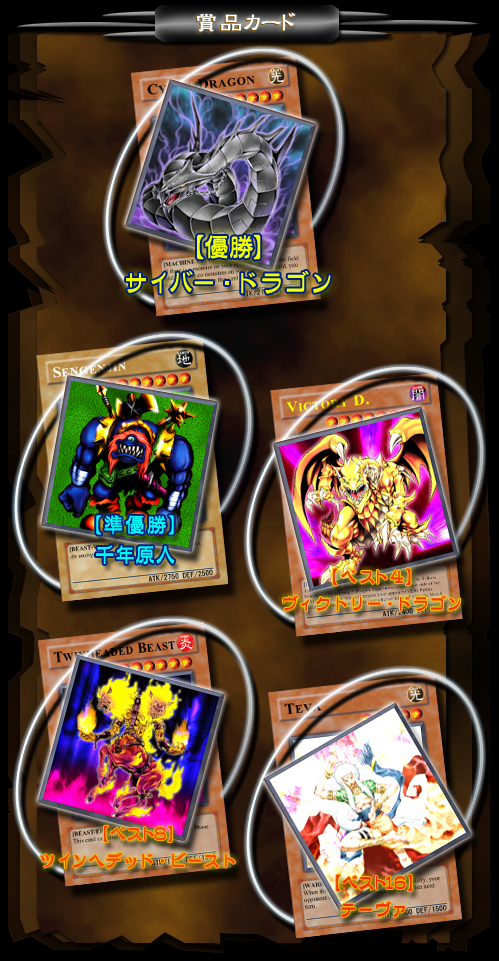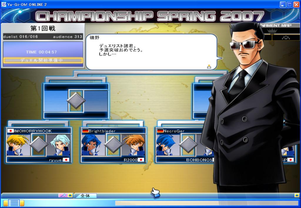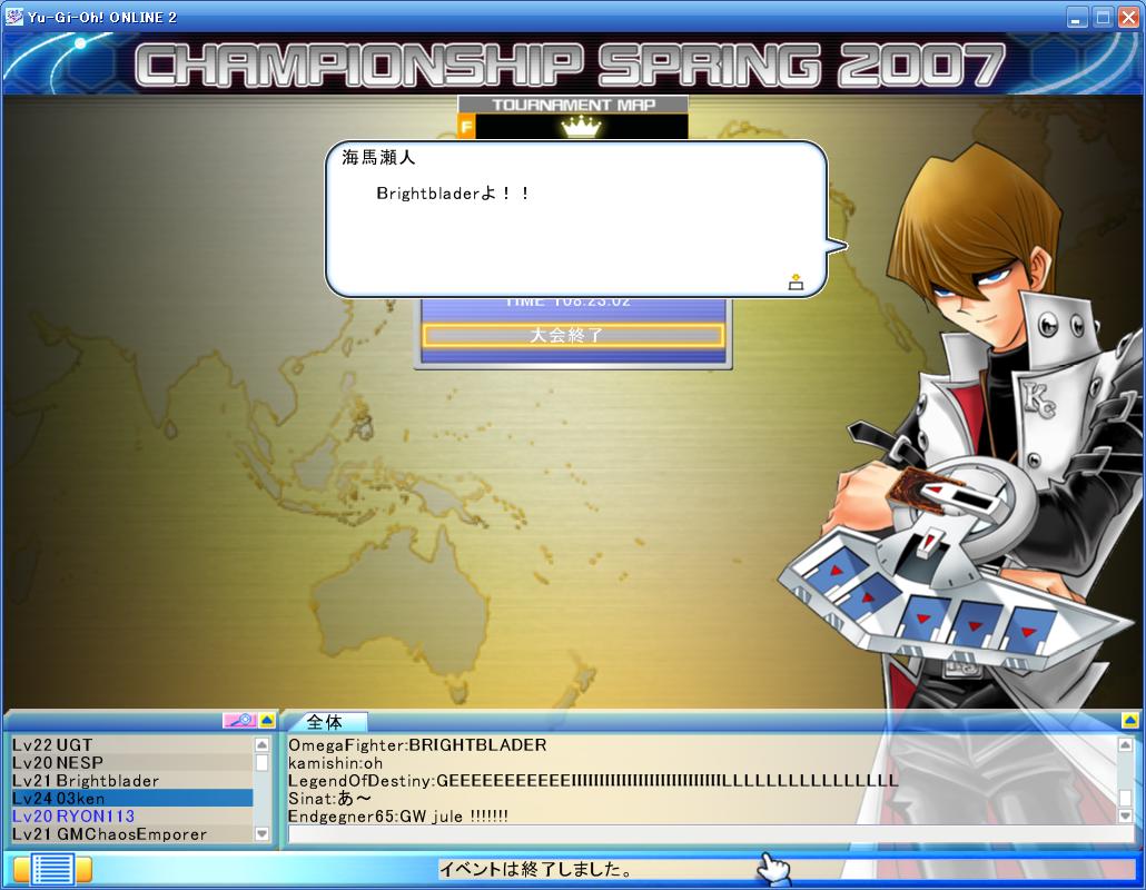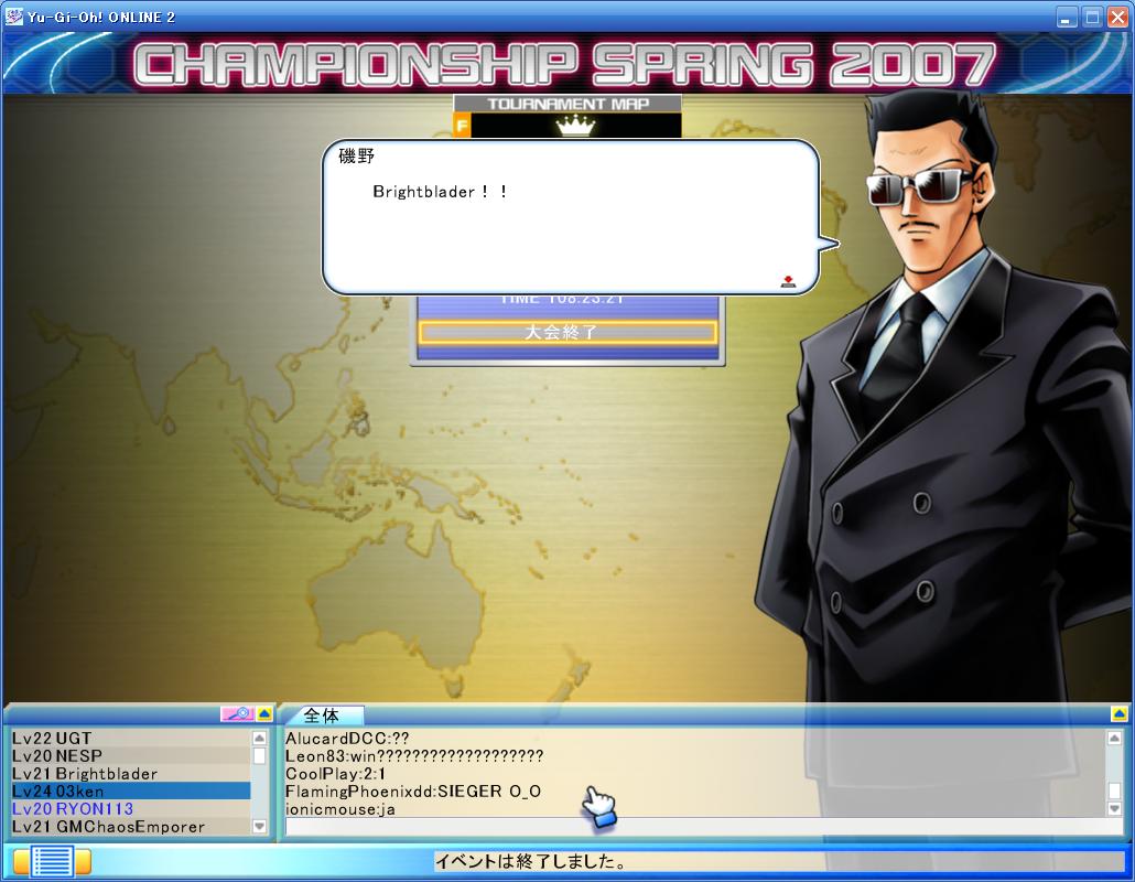 CHAMPIONSHIP SPRING2007 決勝大会 CHAMPIONSHIP 2007年04月22日 いよいよ、決勝大会。まずは磯野登場。組み合わせ左側。組み合わせ右側。そして、ファイナル。優勝者はBrightBladerさん。準優勝者はRYON113さん、ふたりともおめでとう。そして、社長の挨拶。全日程これにて終了。賞品は下記の通り。優勝 《サイバー・ドラゴン》(ヘルカイザ-仕様)準優勝 《千年原人》ベスト4 《ヴィクトリー・ドラゴン》ベスト8 《ツインヘデッド・ビースト》ベスト16《テーヴァ》いいものでましたが、また準優勝がちょっとかわいそう。Vドラは欲しいなあ。ベスト8と16はTPでえらべればどちらかを取りたいと思います。