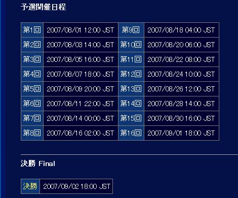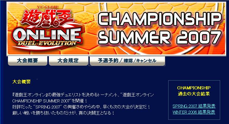 CHAMPIONSHIP SUMMER 2007 CHAMPIONSHIP 2007年07月11日 チャンピオンシップの日程が発表された。上記が日程。とりあえず、最初の参戦は第3回。サブで第6回も予約。前回、準々決勝で負けた雪辱をはらすべき時が来た。