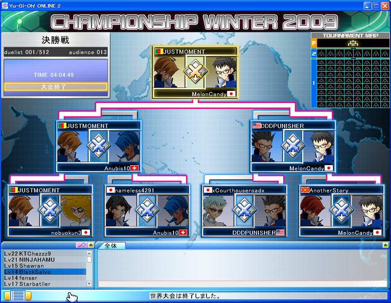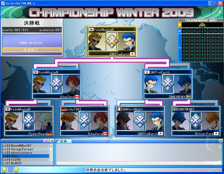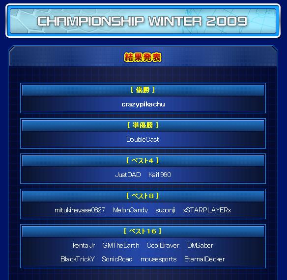 YUGIOH ONLINE CHAMPIONSHIP WINTER 2009 予選第16回 CHAMPIONSHIP 2009年12月05日 さて最後の予選参加ですが2垢で一回戦落ちw。2垢とも馬アンデに沈みました。