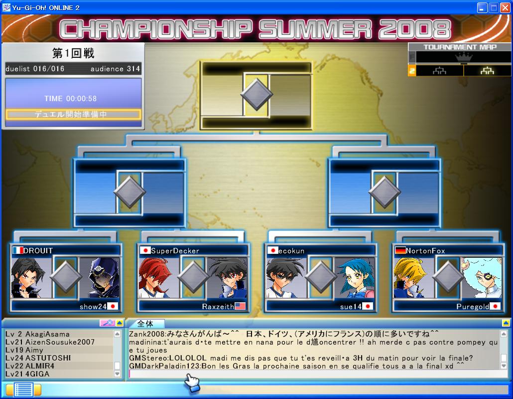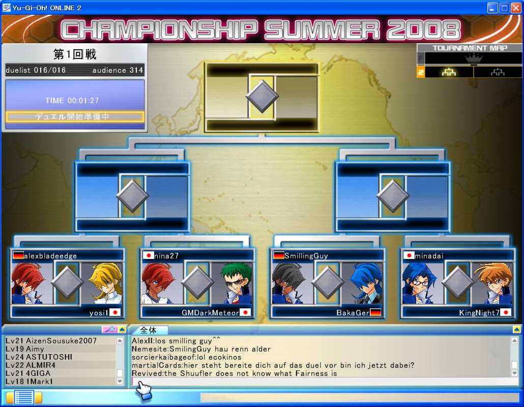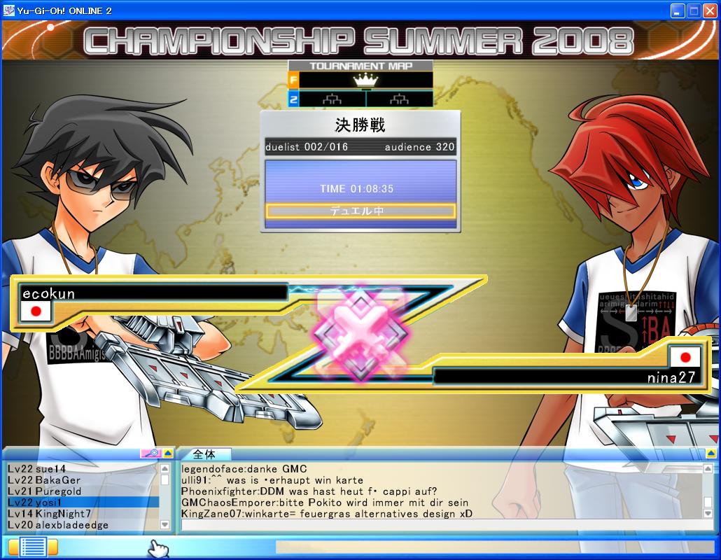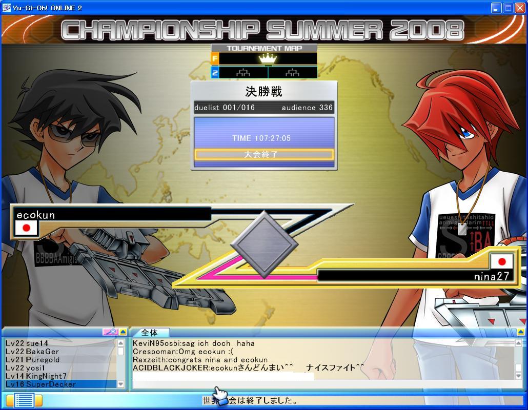 YUGIOH ONLINE CHAMPIONSHIP SUMMER 2008 決勝大会 CHAMPIONSHIP 2008年08月24日 YUGIOH ONLINE CHAMPIONSHIP SUMMER 2008 決勝大会 いつものように磯野の挨拶左側、我らがリ-ダ-はこちら側にこちらが右側、激戦区です。そして決勝。ダ-クネスは初戦で負けてしまったが惜しかったと本当に思う。minadaiさんも準決勝まで行かれたがエラ-落ちと言う残念な結果に、しっかりせいやKONAMI。結果、優勝はnina27さん。おめでとうございます。ecokunさんも惜しかった。大会終了後、ダ-クネスにお願いして景品見せて貰いました。サンキュ-、ダ-クネス。さて、夏のイベントもあと2つです。TPランキング、二垢維持に本腰入れたいと思います。優勝景品は下記の通り優勝《ギルフォード・ザ・ライトニング》(SJ2仕様)準優勝《E・HERO バーストレディ》(エド、覇王仕様)ベスト4《ダメージ・ポラリライザー》 ベスト8《フュージョン・ガード》 ベスト16 《リターンソウル》 PR